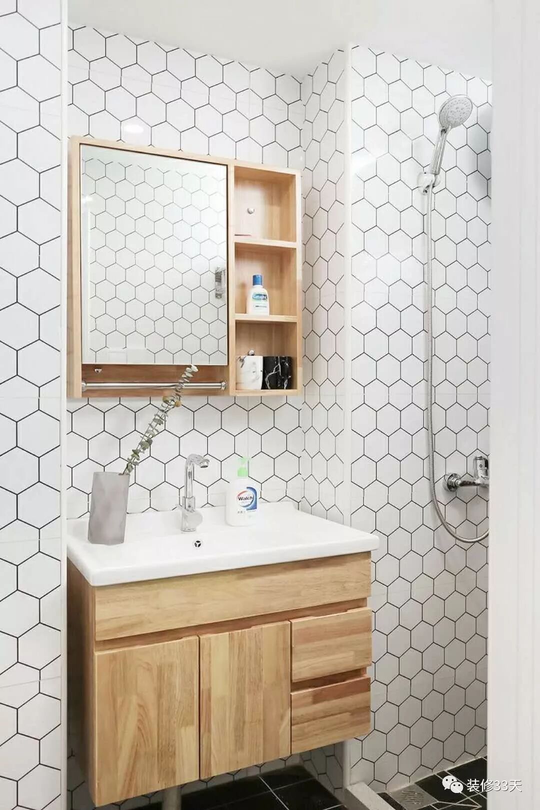 ▲ 卫生间深色地砖搭配六角砖上墙,加入原木色台盆柜与镜柜,营造小清新的洗浴空间