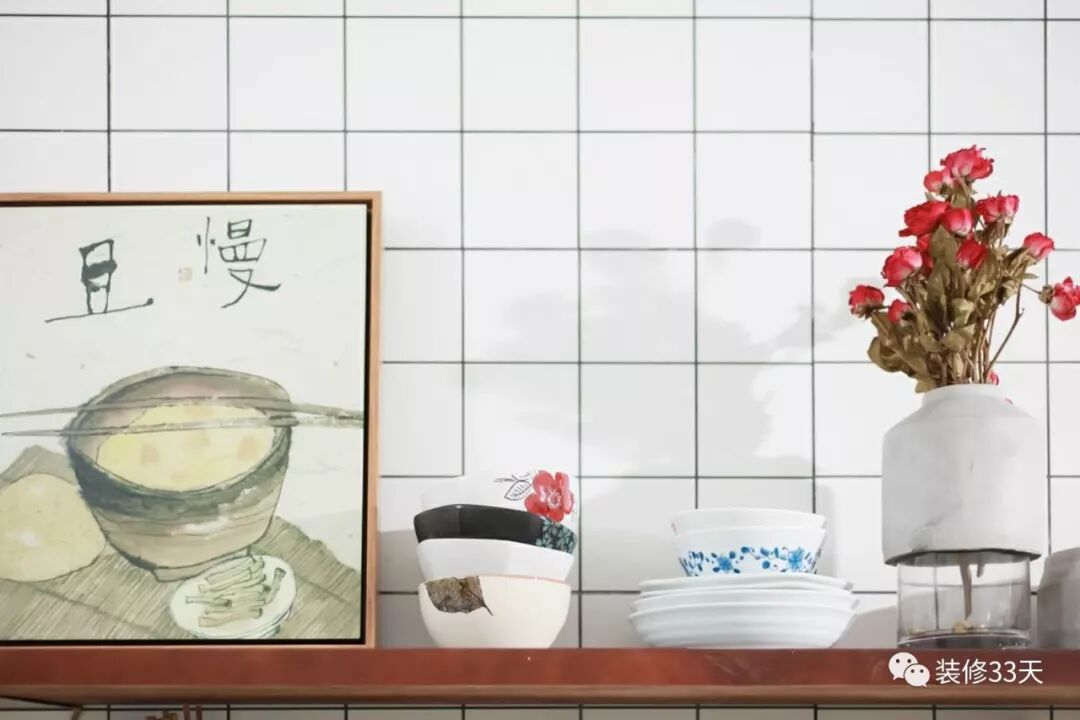 ▲ 层板上方便放置常使用的餐具,点缀装饰画与干花,文艺清新