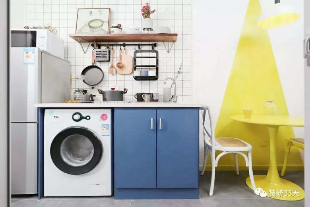 ▲ 户型进行调整后将餐厨移至入户区域,一字型橱柜内嵌洗衣机,餐厨合一,餐厅一抹柠檬黄提亮空间