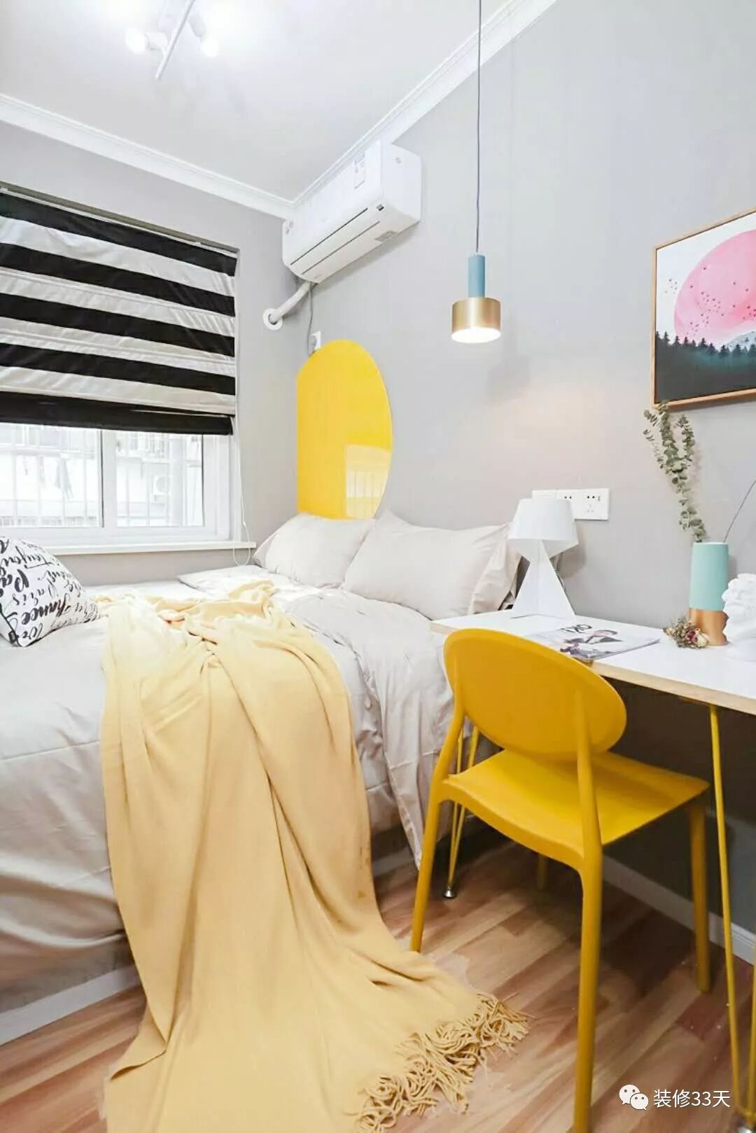 ▲ 小尺寸写字桌取代床头柜,亮黄色桌脚与单椅呼应,点缀方形装饰画与金属元素悬挂吊灯
