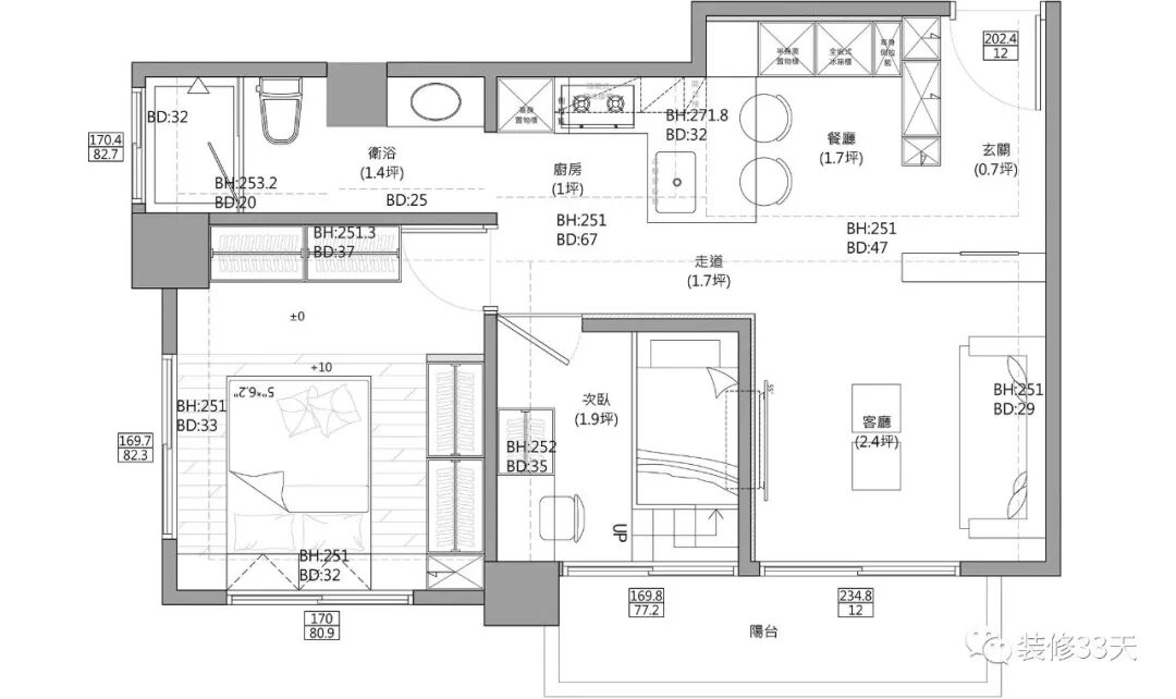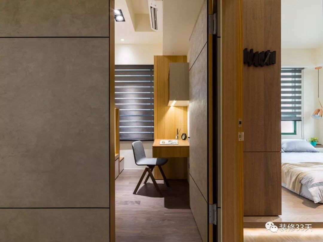 ▲ 从电视墙面上,即运用线条的延伸,转折导引进入次卧的动线,以线条作出门片隐形化的细致处理
