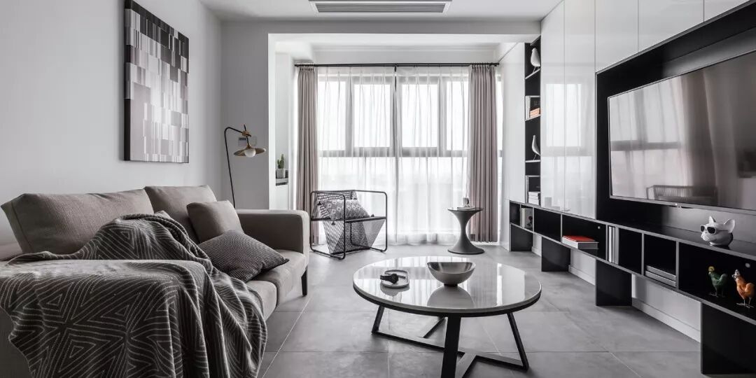 ▲ 客厅地面通铺灰色石纹砖,极简顶面用点光源取代吊灯