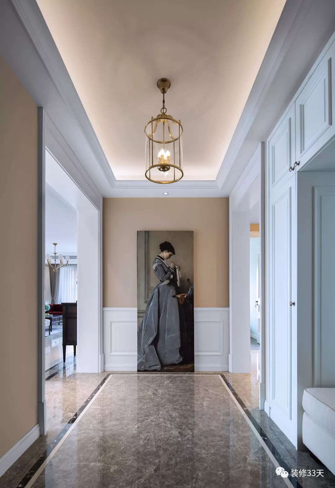 ▲ 建筑面积185平,总造价120万,入户以大幅油画作端景,右侧设计系统柜兼具收纳与换鞋机能