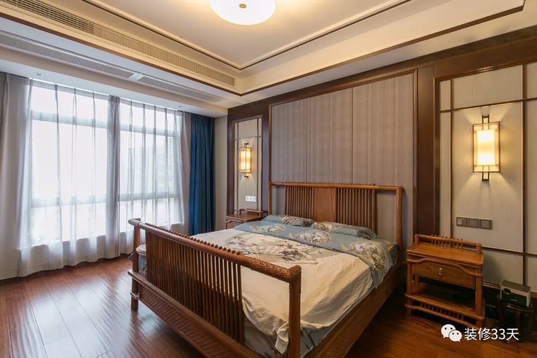▲ 主卧,对称的背景造型与客厅背景呼应,精细的雕花家具充满东方气息,暖暖的色调让人心生安宁