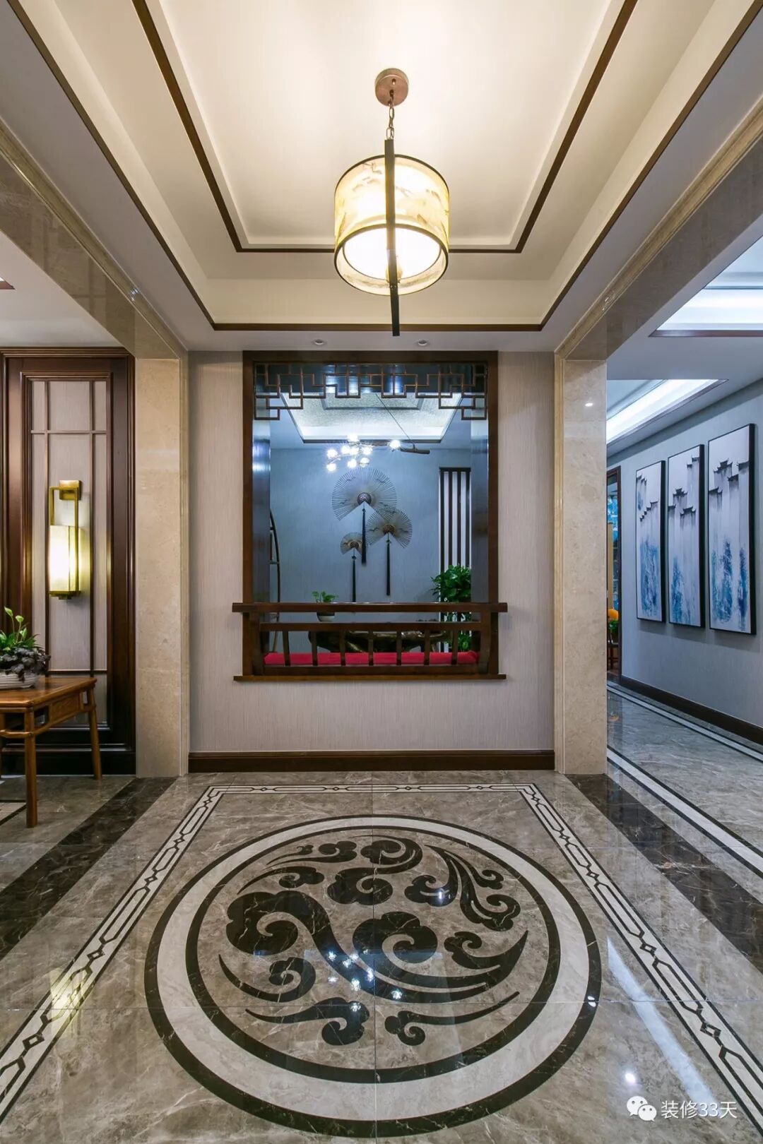 ▲ 建筑面积149平, 总造价80万,入户拼花瓷砖地面,玄关端景用庭院式茶室代替