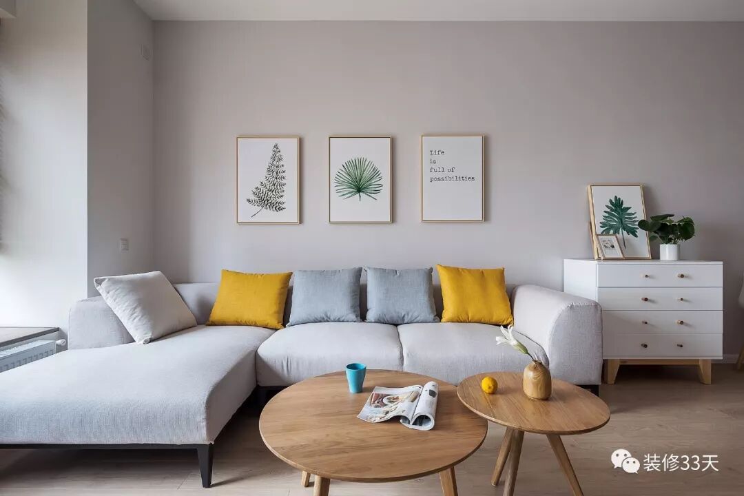 ▲ 灰调主沙发点缀跳跃色靠枕,浅色墙面点缀三幅简框画作沙发背景墙