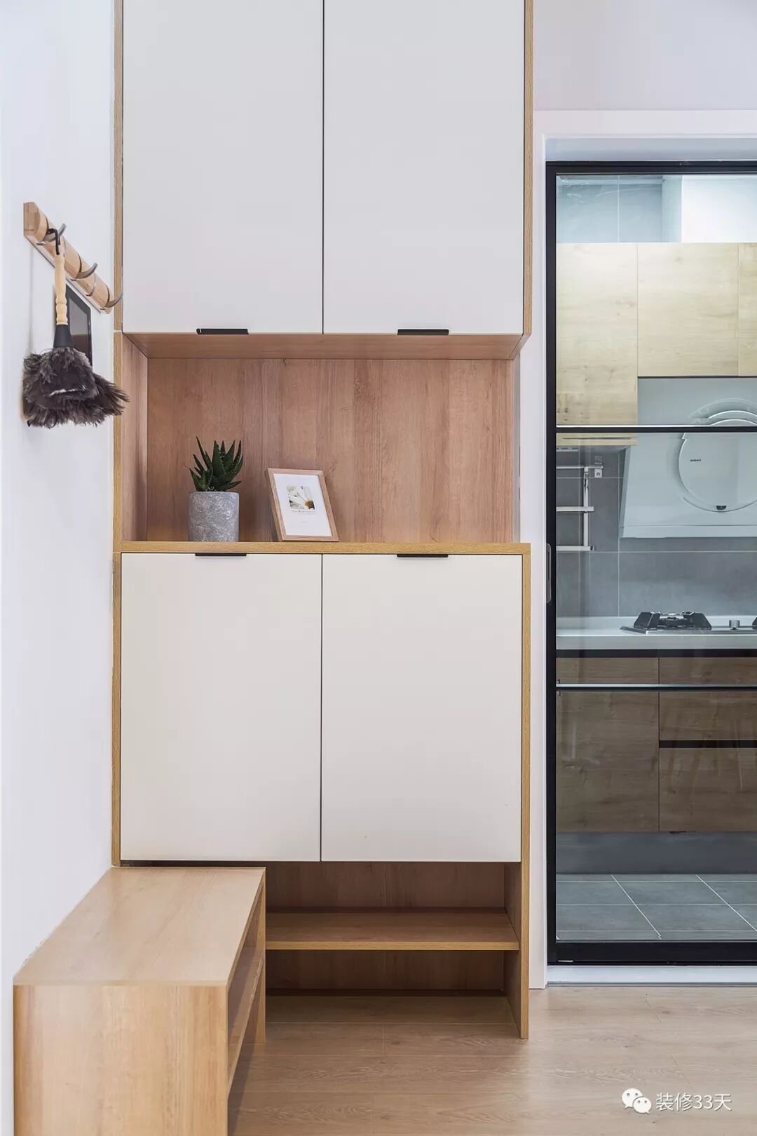 ▲ 建筑面积110平,入户换鞋凳,衣帽钩,分体鞋柜,白色与木色穿插,给人轻松的视觉感