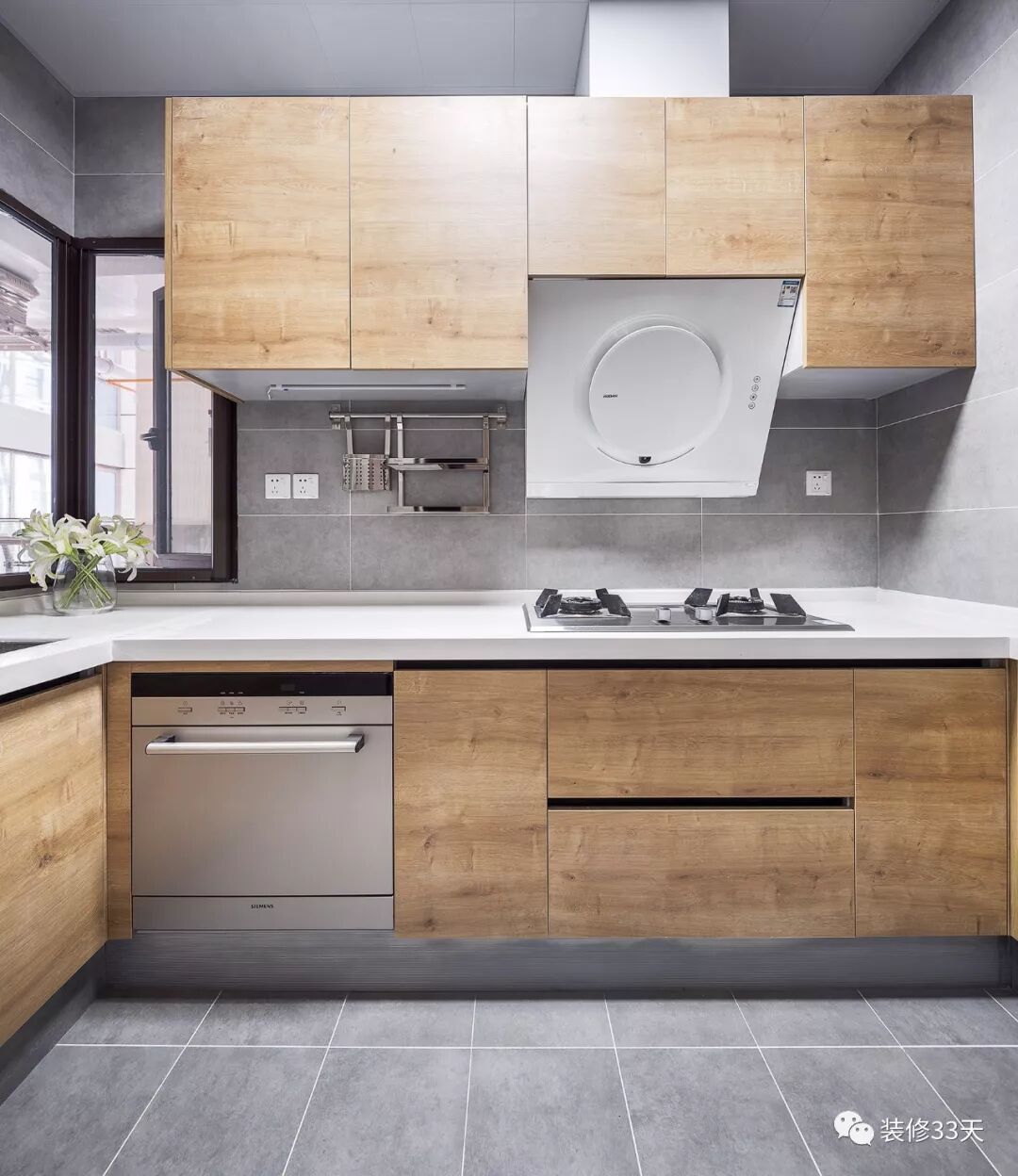▲ 厨房地面与墙面通铺水泥灰色瓷砖,木纹橱柜与白色台面,整体色调轻松自然