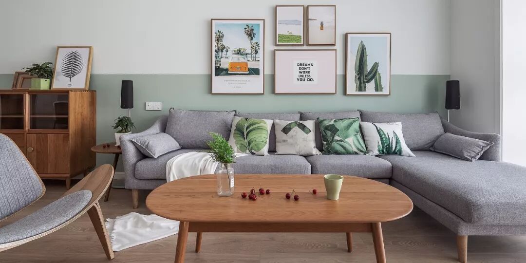 ▲ 客厅原木色地板搭配浅灰色墙面,不做吊顶,装一盏北欧风吊灯,简洁干净