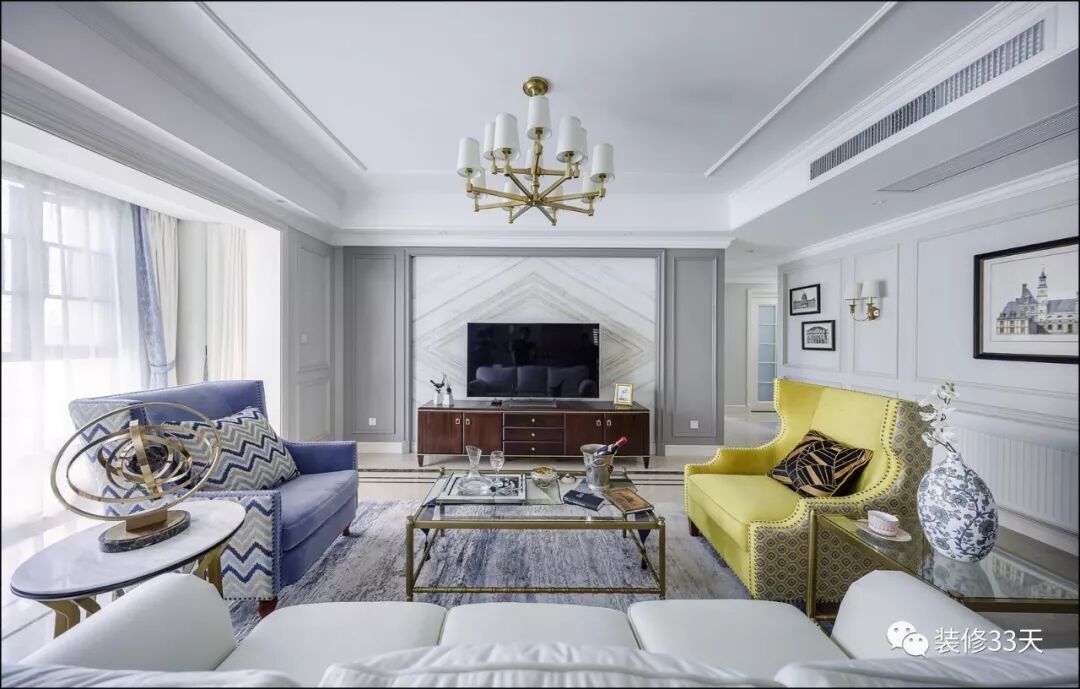 ▲ 对称电视背景,以大理石、不锈钢嵌条、木饰面塑造造型