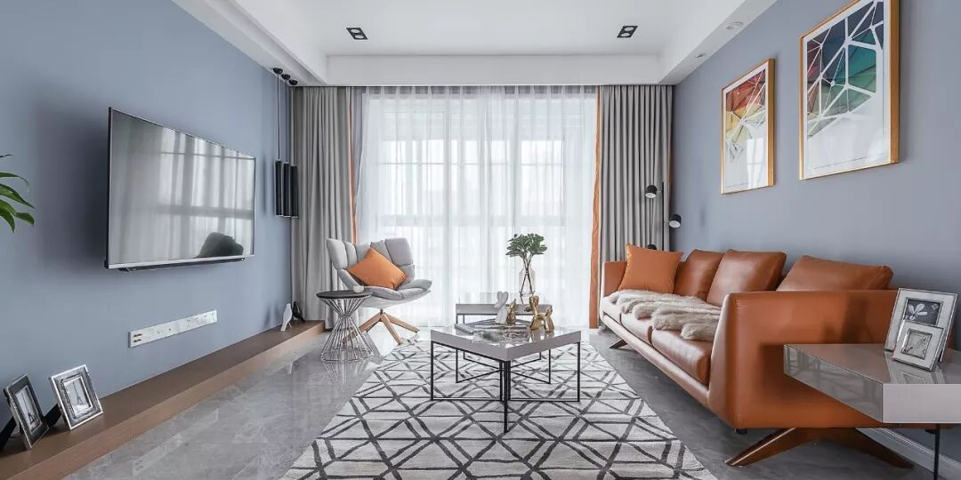 ▲ 客厅通铺仿石纹地砖加铺大张地毯,浅灰褐色背景墙通过大幅装饰画点缀