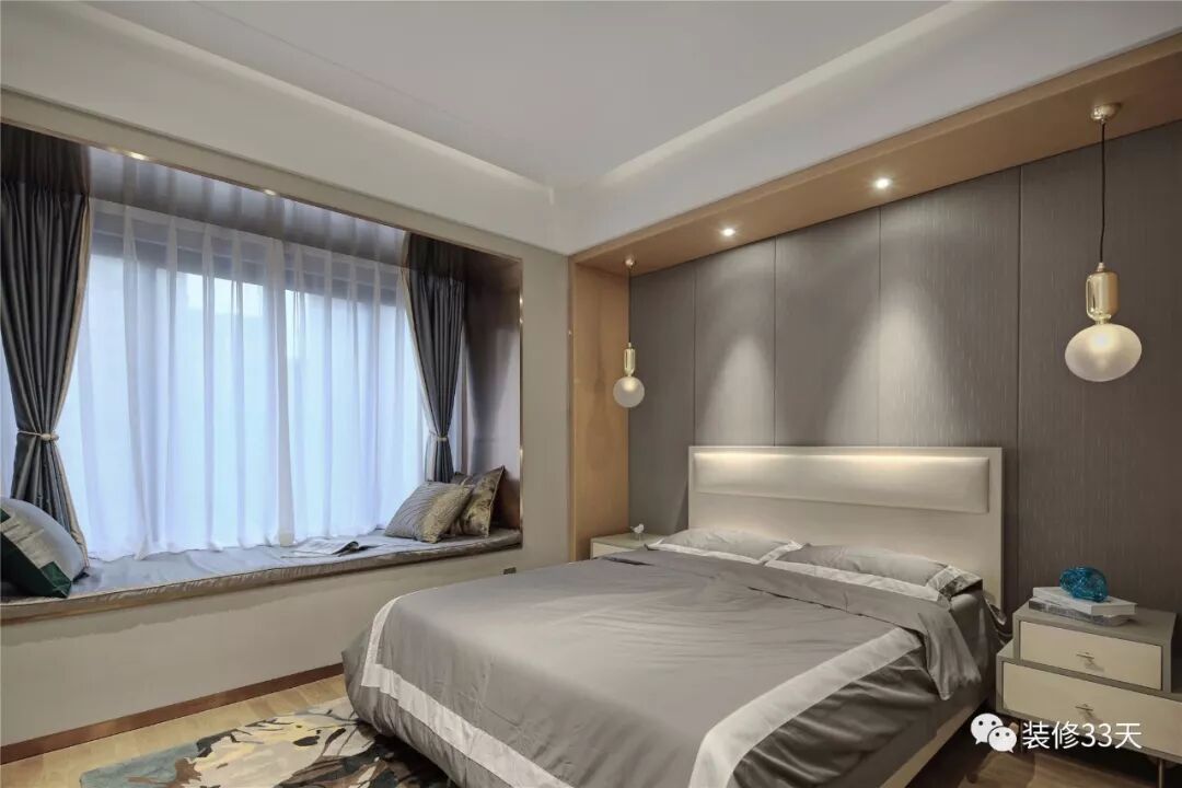 ▲ 主卧套间则是最大化满足舒适需求,木皮与硬包对称安置造型壁灯,舒适飘窗休闲温馨