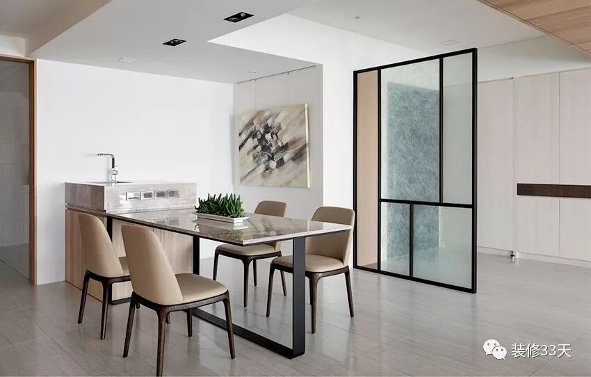 ▲ 业主为台商,常住海外希望归家具有休闲度假氛围,入户采用金属与夹沙玻璃搭配组合作隔断