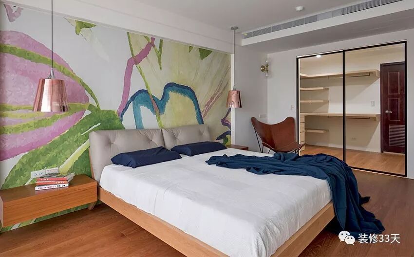 ▲ 主卧通铺木色地板,油画质感的壁纸作床背景,通过玻璃移门作步入式衣帽间的隔断,确保光线视野的穿透延展