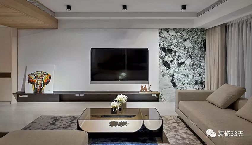 ▲ 电视主墙,左侧则为整面素雅白墙,搭配右侧纹理丰富的翡冷翠大理石