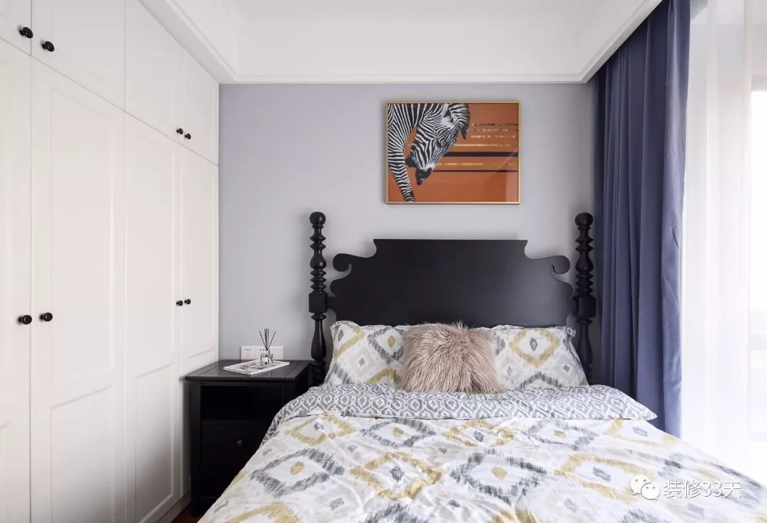 ▲ 次卧,背景墙与窗帘,采用同色调深浅搭配,纯黑色美式大床搭配白色储物柜,橙色斑马装饰画点缀空间