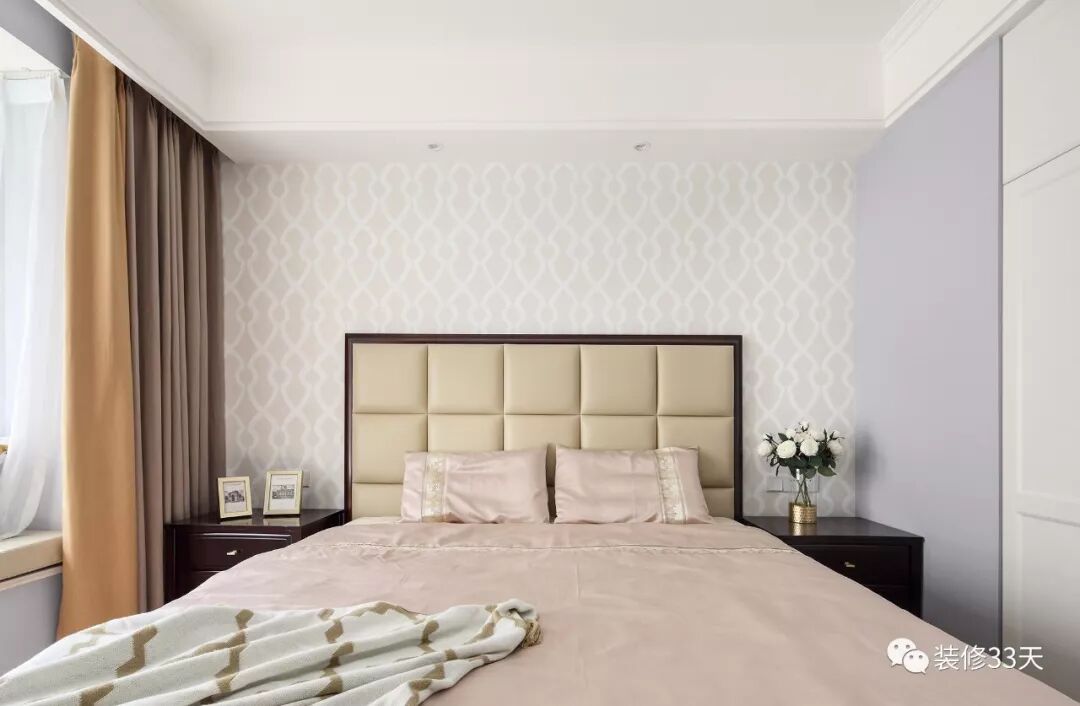 ▲ 浅色系几何图案壁纸,衬托出美式家具的质感,床品也以舒适为主,体现轻奢美式的细节