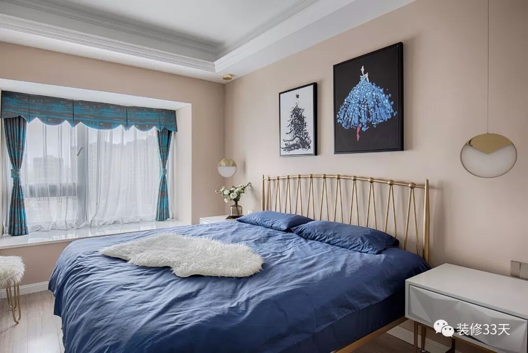 ▲ 主卧,浅杏色墙面让房间多了几分温柔,不同色调的蓝色营造沉稳安静的舒眠氛围
