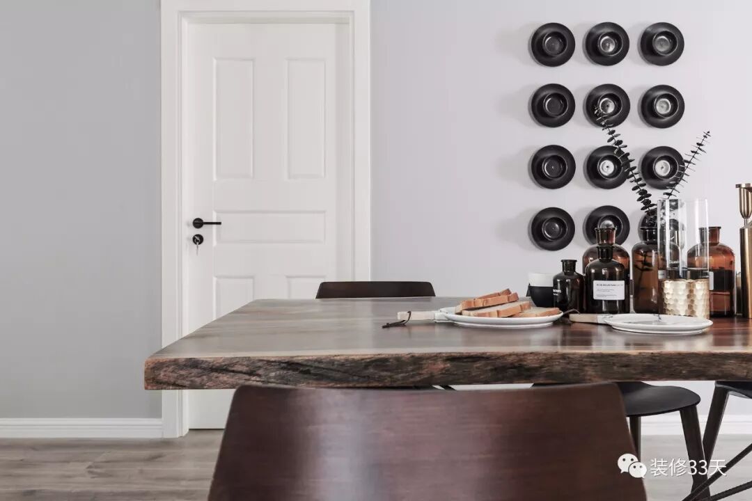 ▲ 进口原木的厚重感与色调,在周围浅色背景的烘托下,轻重有度,墙面用餐盘DIY点缀,不雷同有个性