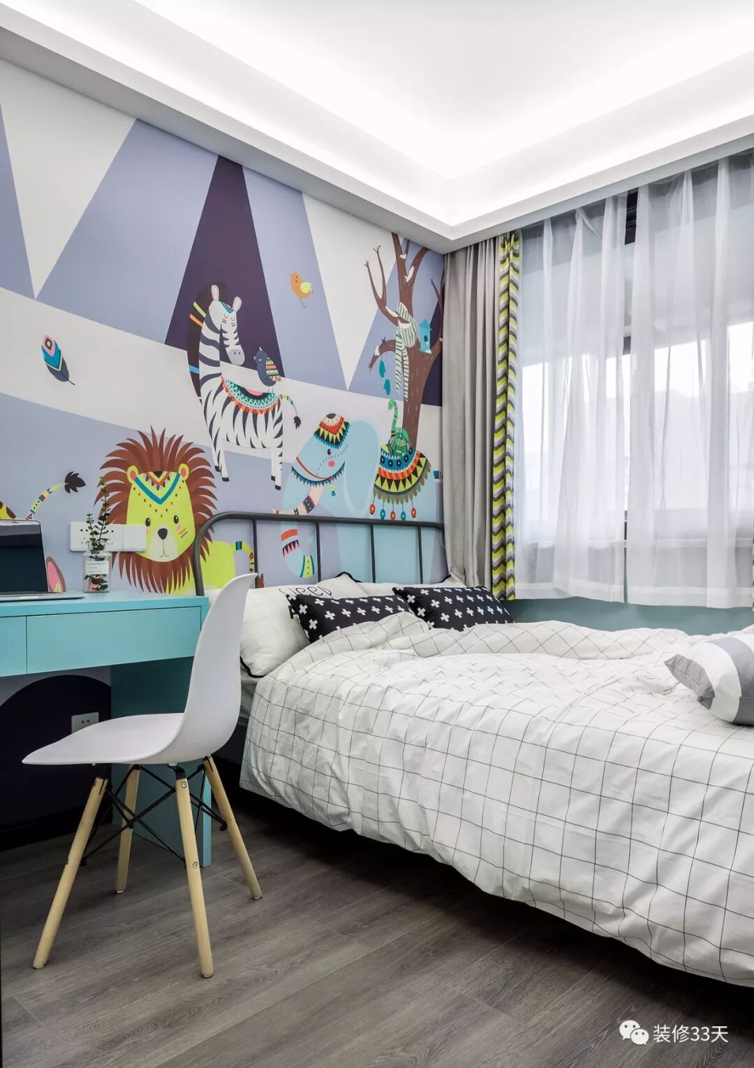 ▲ 儿童房以充满活力色彩的壁纸为主题,搭配简单的铁艺床与蓝色书桌,美观又实用