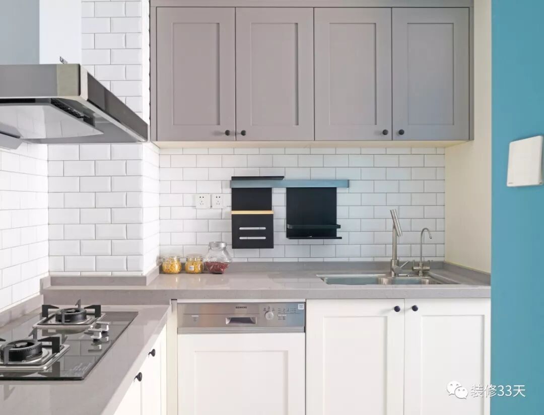 ▲ 利用生活阳台扩大厨卫空间,L型橱柜,台板,墙面色调相互穿插,干净整洁