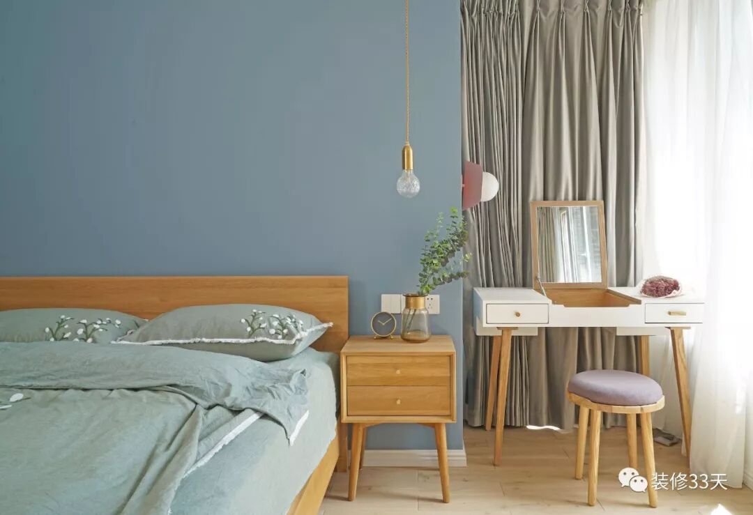 ▲ 蓝色乳胶漆墙面与公领域基调呼应,点缀金色元素软装,简洁精致,并利用阳台位置增设出梳妆台