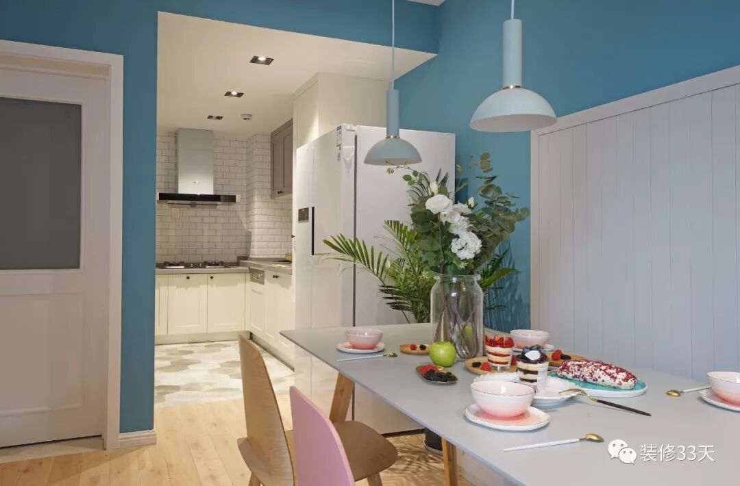 ▲ 入户进来是卡座餐厅,节约整体空间并增添储物机能,白色靠背与蓝色墙面调和出清爽色调