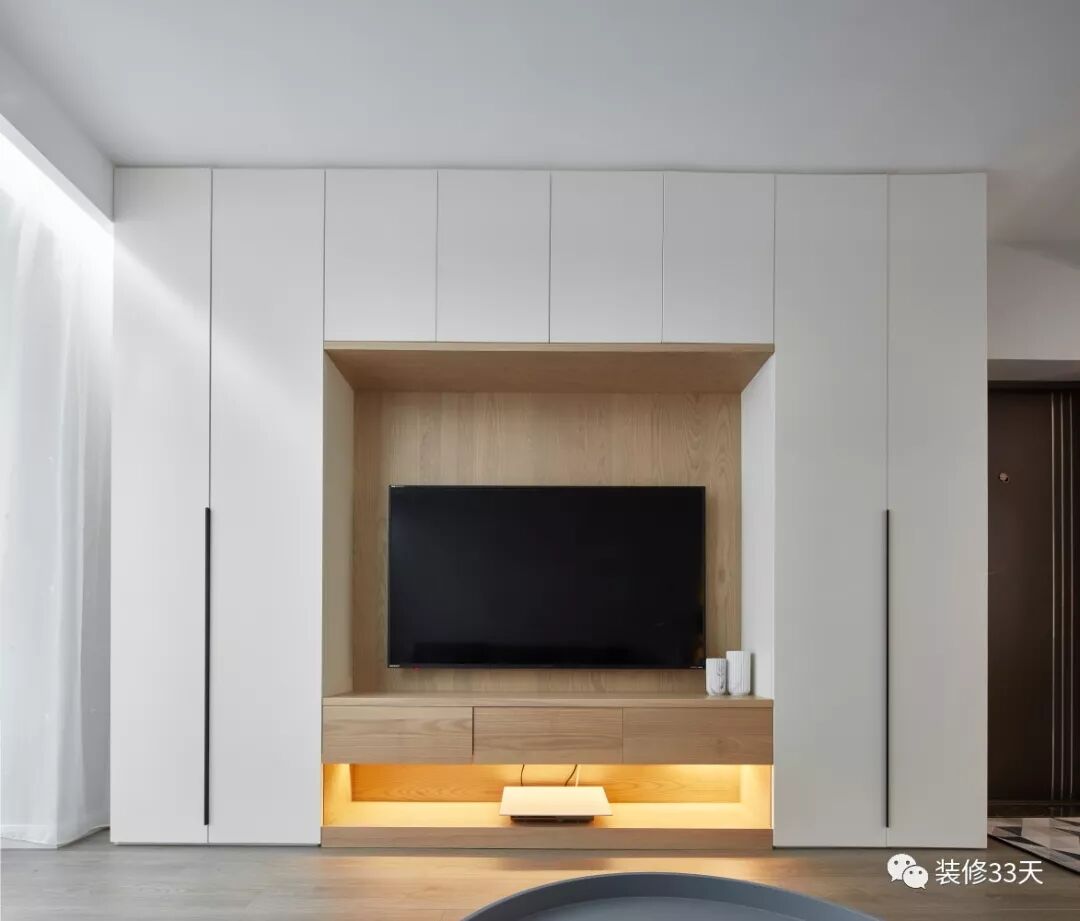 ▲ 电视背景墙以组合柜的形式设计,木与白反差搭配加入暖调灯光,在冷色系的整体定位中,合理融入木质的温馨