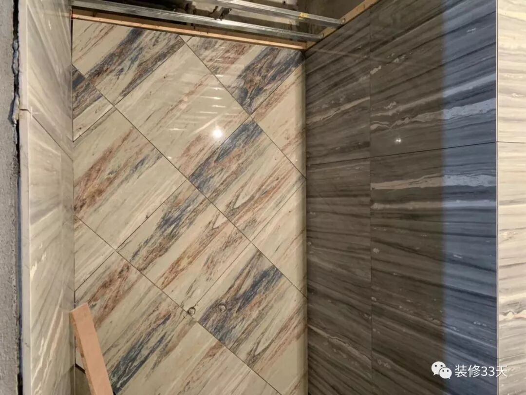 还有一点不满意就是主卫瓷砖纹理比较复杂,其实如果能排一下,对一下纹理,还是会稍微美观一些,当然这个对师傅审美要求有点高了,师傅觉得这样挺好看的。铺完这个淋浴房我跟师傅说过之后,其他墙面稍微好一点。