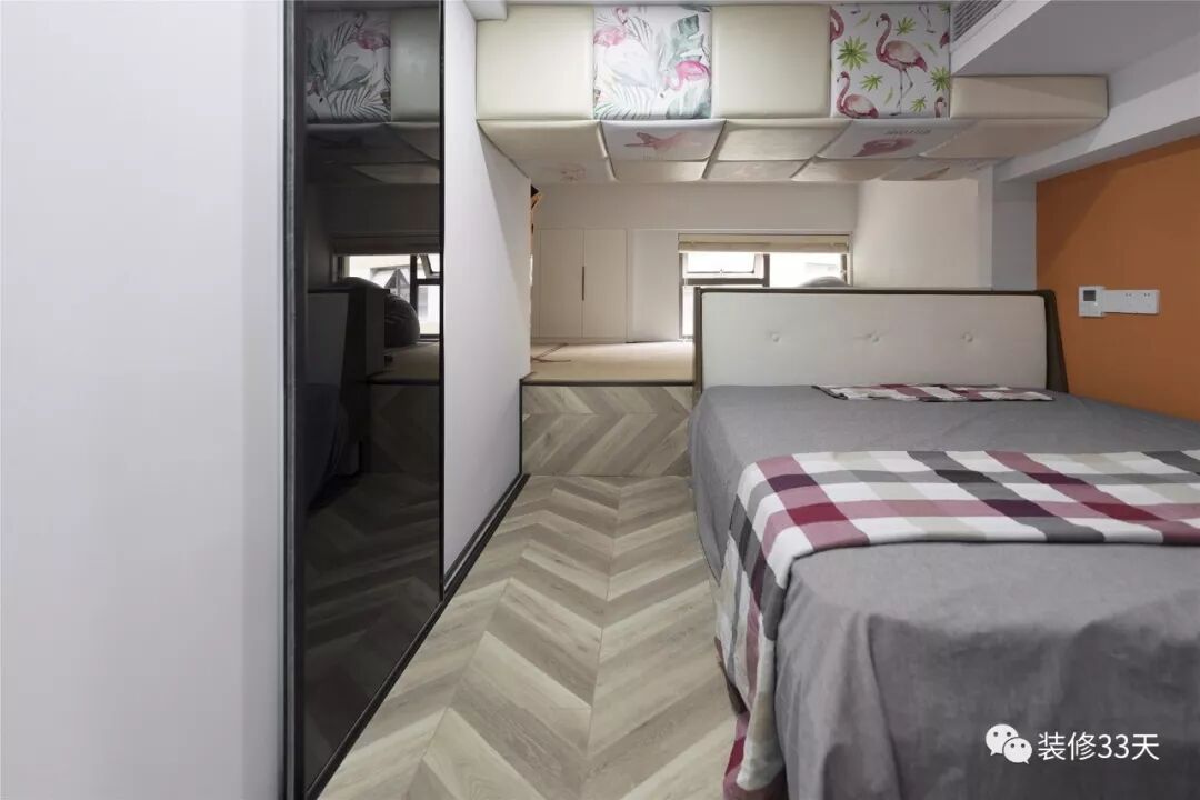 ▲ 卧室,鱼骨拼地板,层高限制顶面作防撞软包,在床背后设计榻榻米