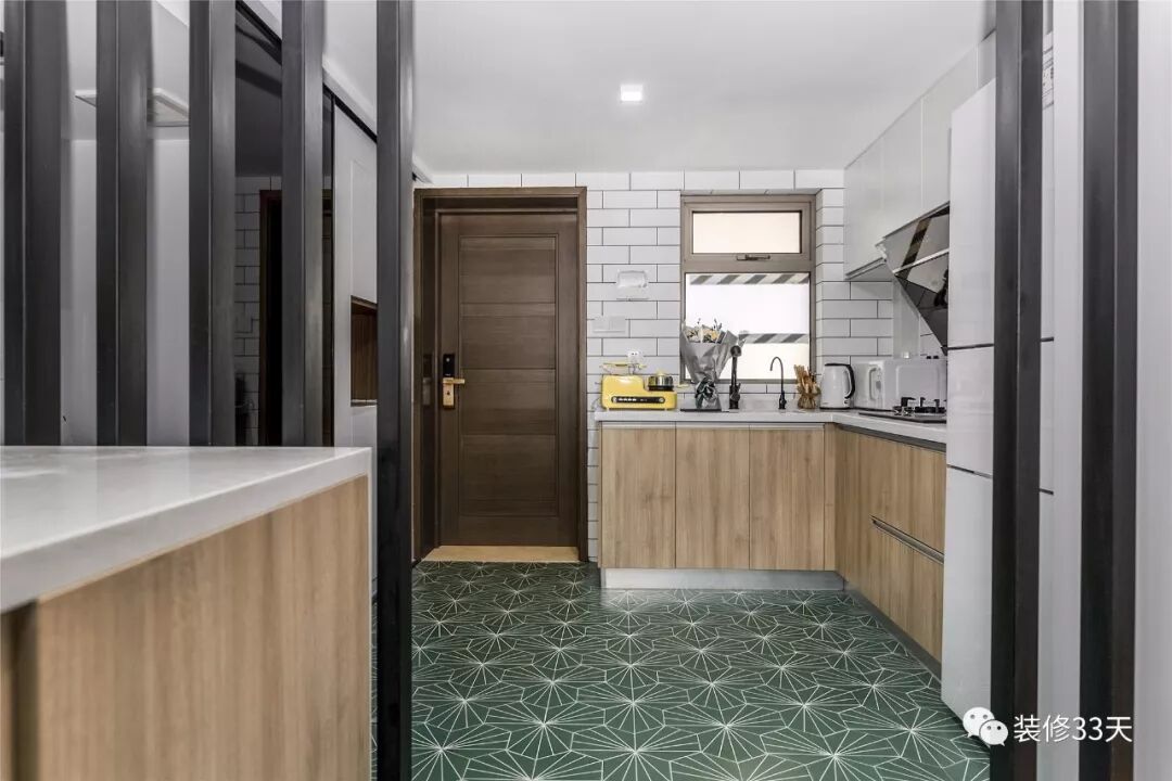 ▲ 厨房木色橱柜配以白色吊柜,隐形不锈钢拉手设计,地面通铺绿色六角砖,使空间变得更为活泼