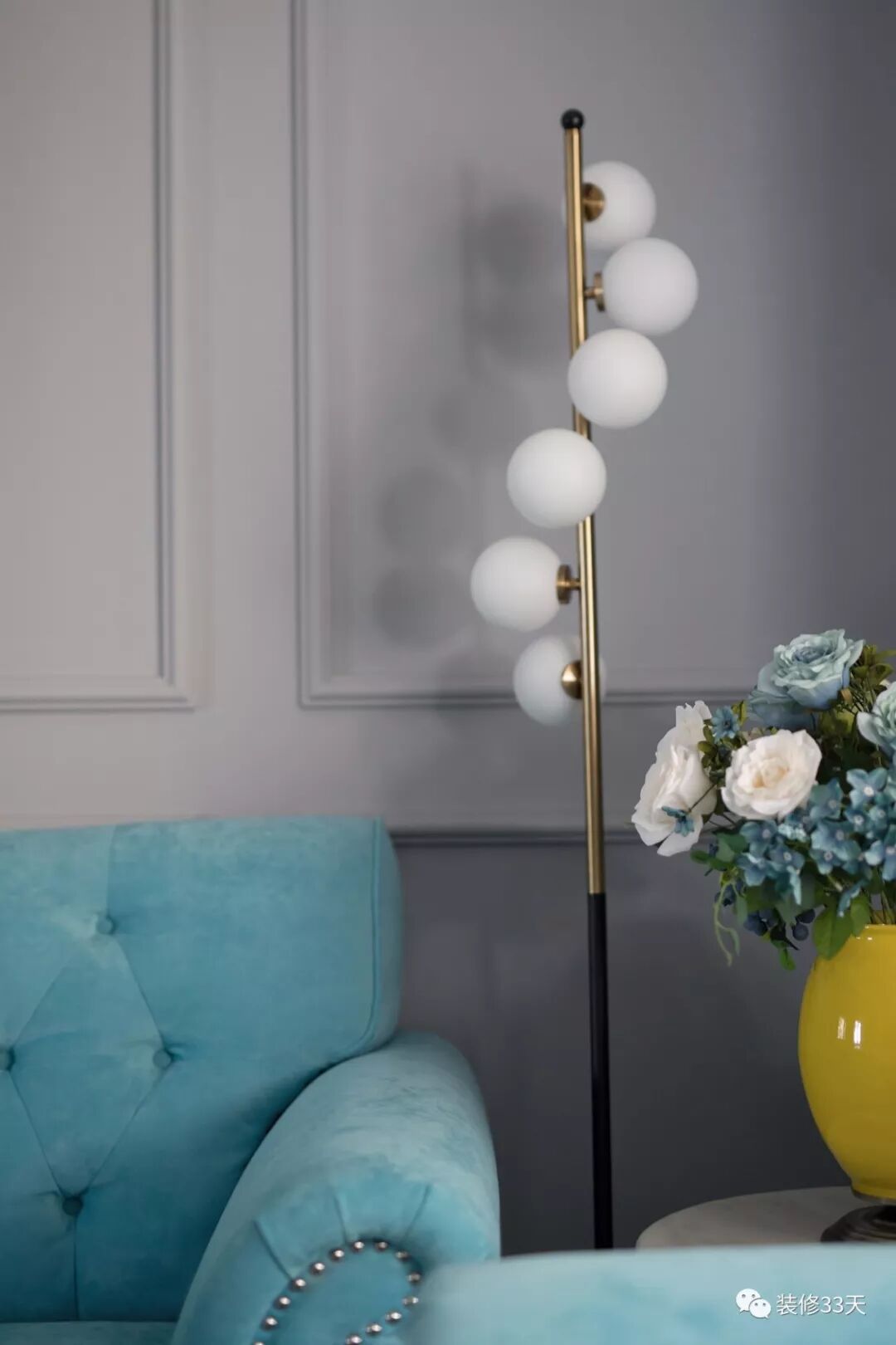 ▲ 客厅,Tiffany蓝色美式沙发呈围和式摆放,搭配石材茶几组与萤火虫吊灯