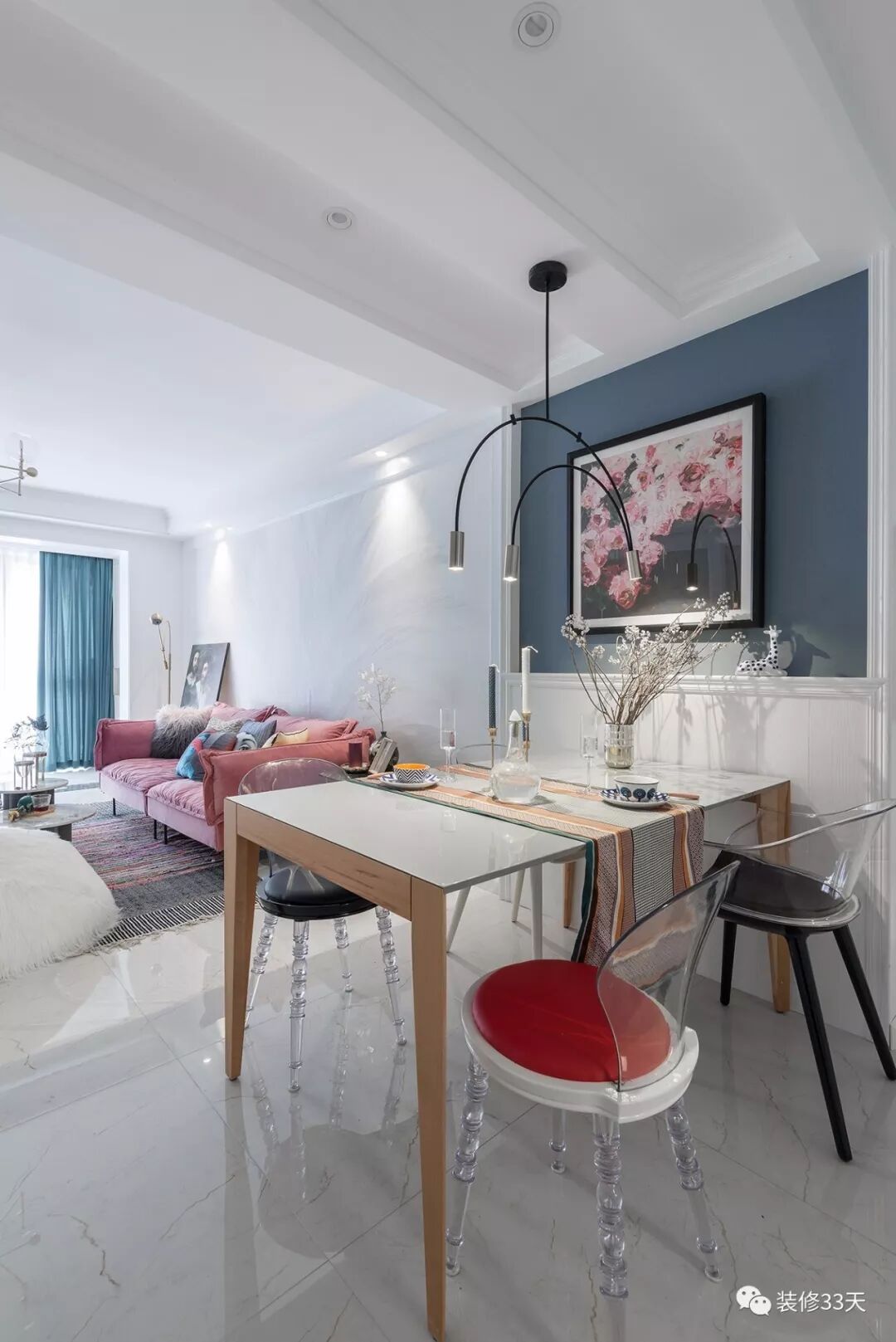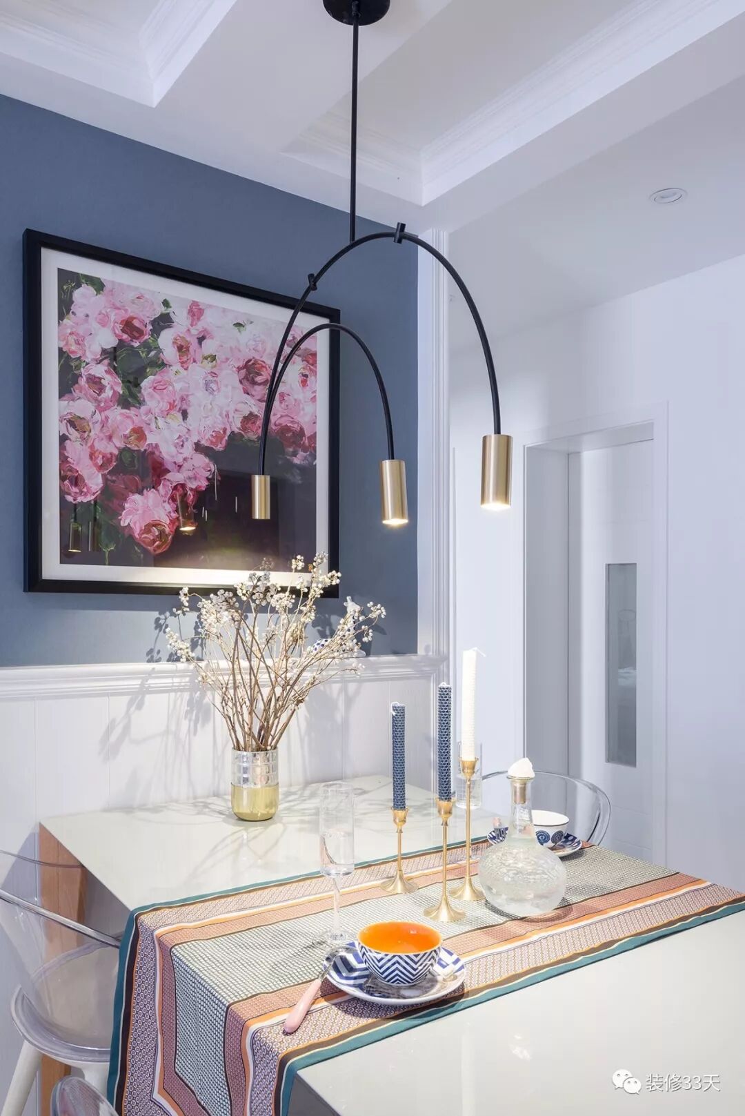 ▲ 入户既是餐厅,白色护墙造型结合蓝灰色背景,点缀浪漫装饰画