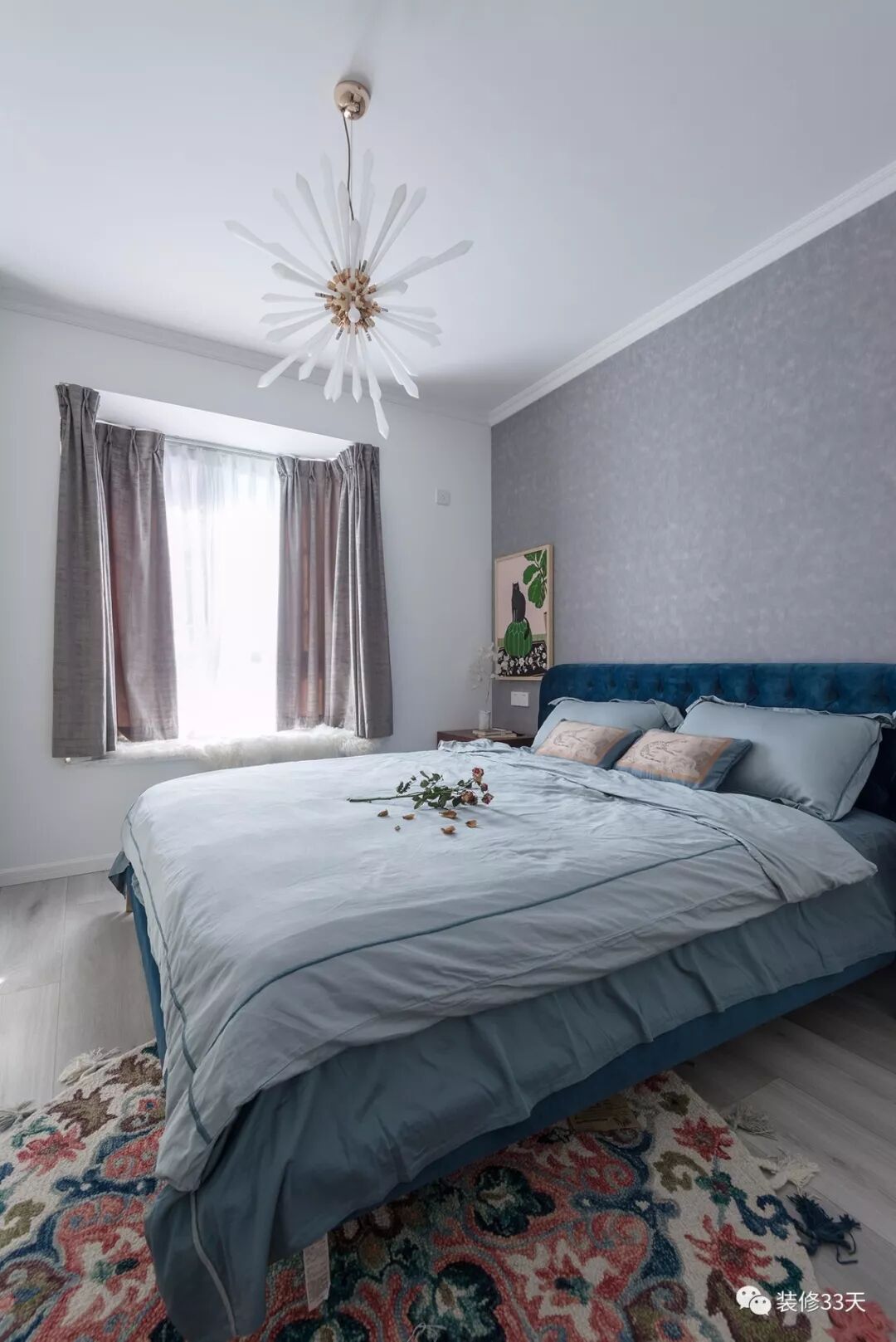 ▲ 主卧,灰色壁纸背景墙搭配蓝丝绒大床,造型吊灯成为空间亮点