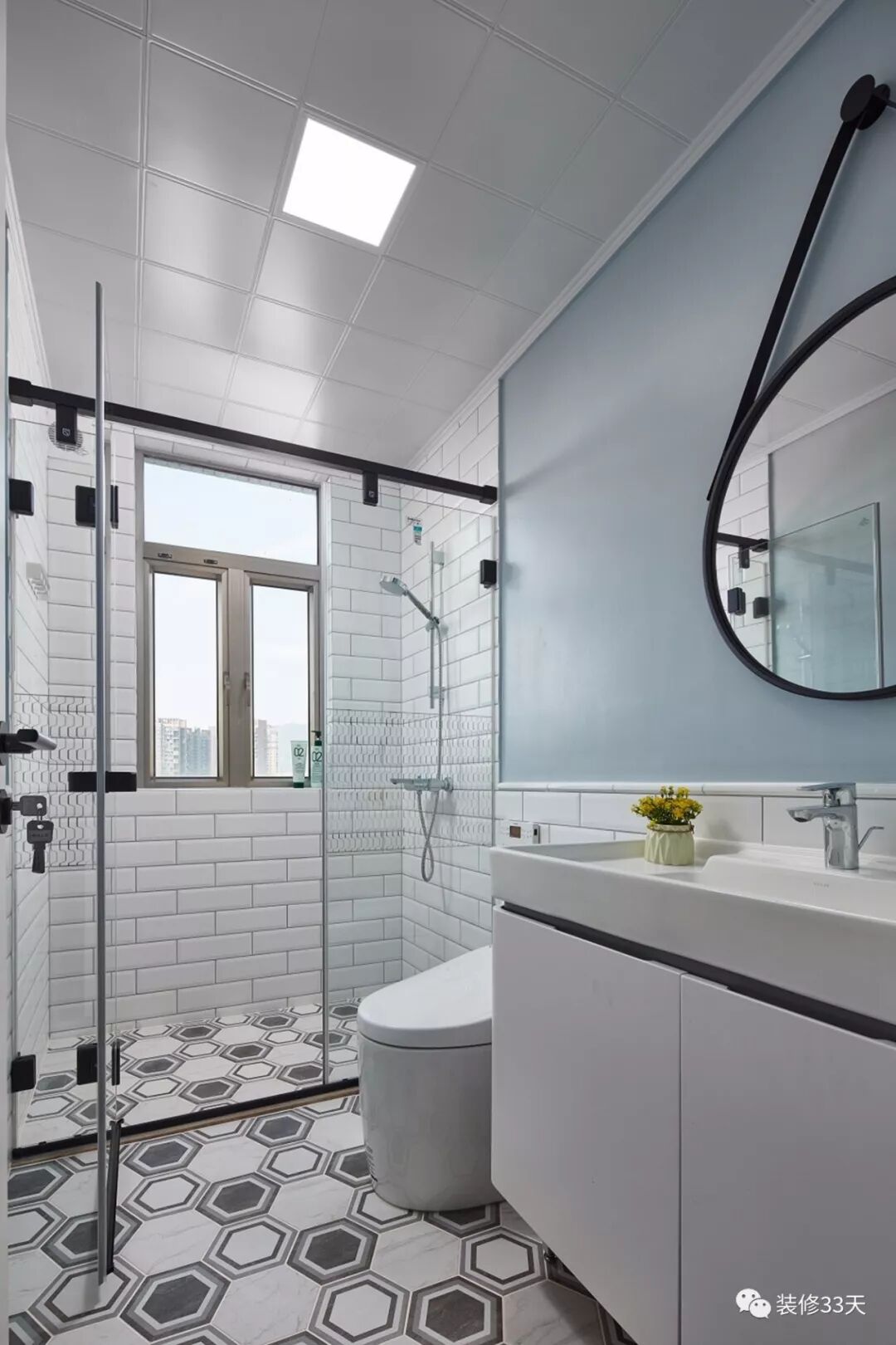▲ 主卫,充满灵动的六边形拼色地砖,墙面采用砖与防水涂料结合,层次感不言而喻