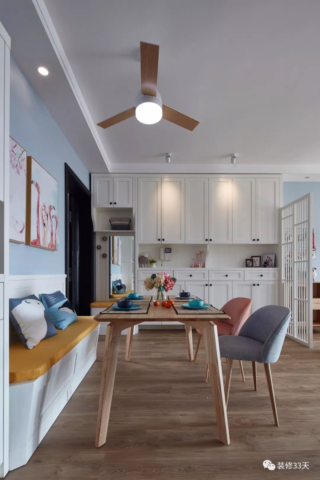▲ 入户右侧即是卡座餐厅,合理的空间布局,清新的色调搭配,采用木框玻璃推拉门与厨房过渡