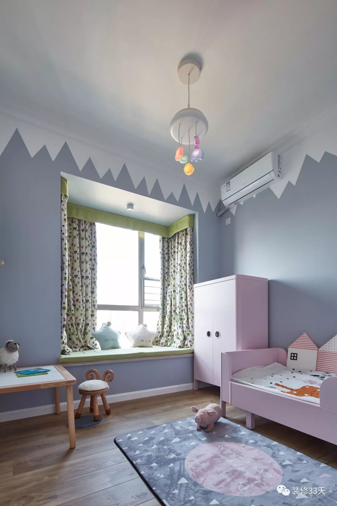 ▲ 墙面乳胶漆突破传统的单色搭配,而采用几何图案分色,让空间充满童趣
