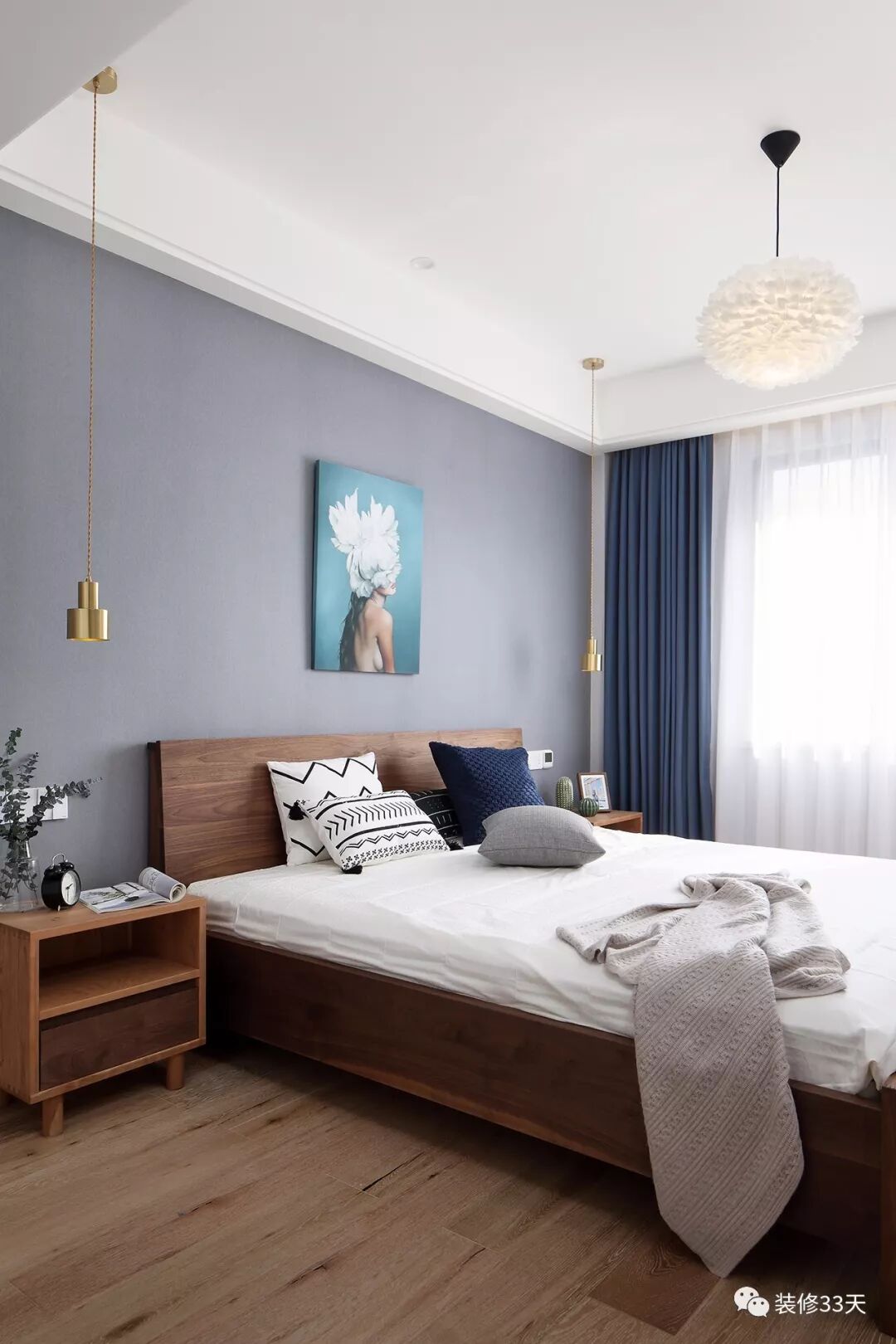▲ 主卧,木色地板搭配木质家具,采用灰蓝的背景色,点缀天使羽翼挂画,强烈的对比,使得整个空间更加立体