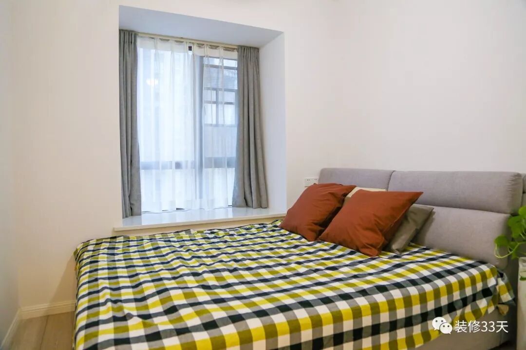 ▲ 主卧,留白空间搭配灰色大床,利用飘窗打造室内休闲一角,并用拼色窗帘提亮