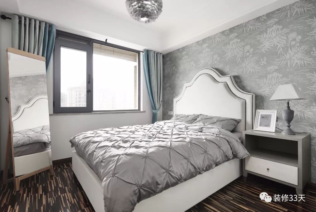▲ 次卧,床头背景铺贴灰白花纹墙纸,灰色床品与羽毛吊灯呼应,床尾放置全身镜