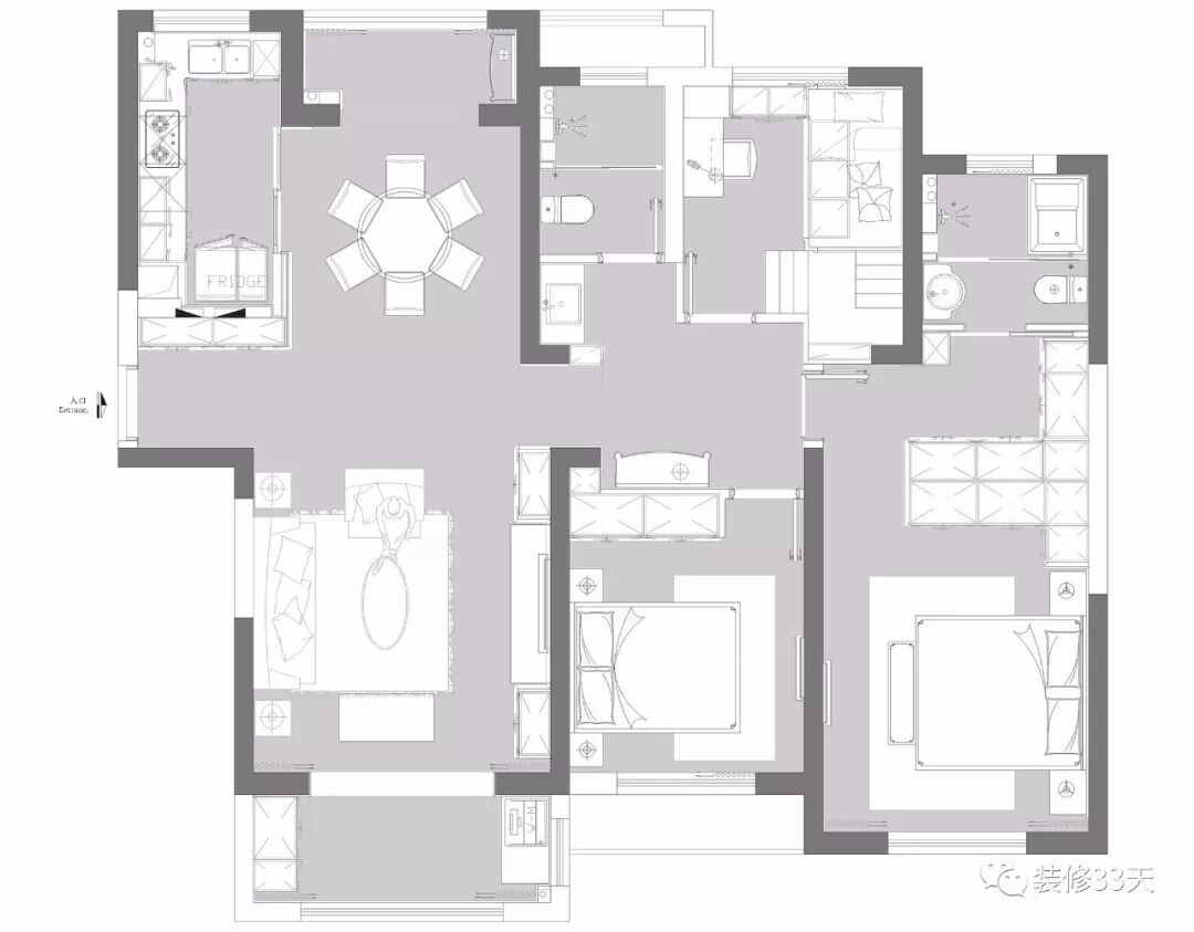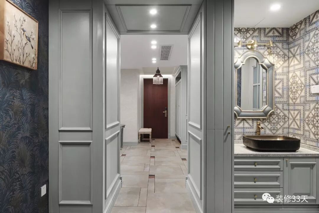 ▲ 建筑面积142平,造价40万(包含主材),玄关区设计架空鞋柜,搭配美式换鞋凳。公领域为开放式空间,入户右侧为客厅,另一侧为餐厅