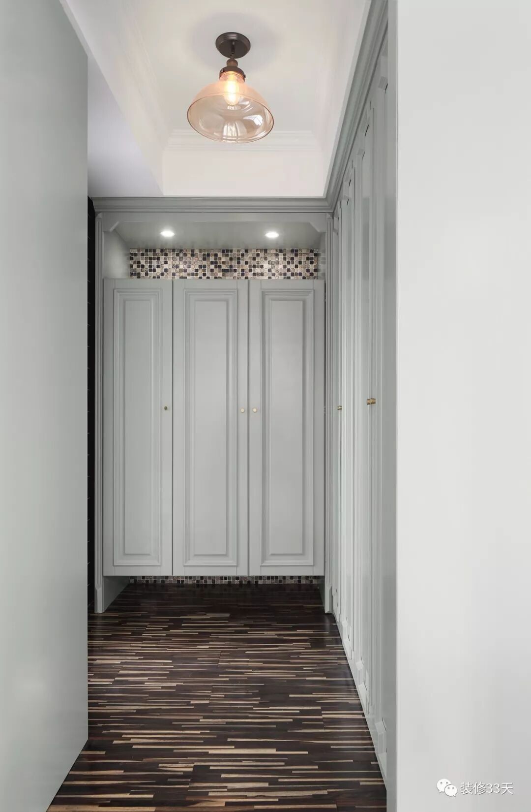 ▲ 衣帽间,整排淡色衣柜,上下镂空换衣间内设计马赛克背景与灯光