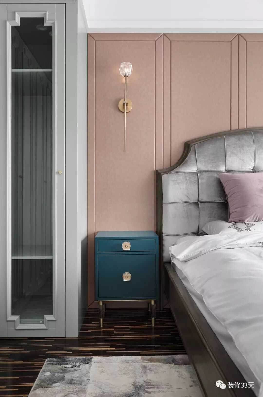▲ 主卧,深色木纹地板上加铺大张黑白纹地毯,床头设计香槟粉硬包背景