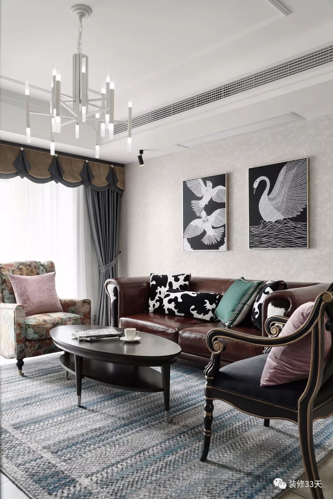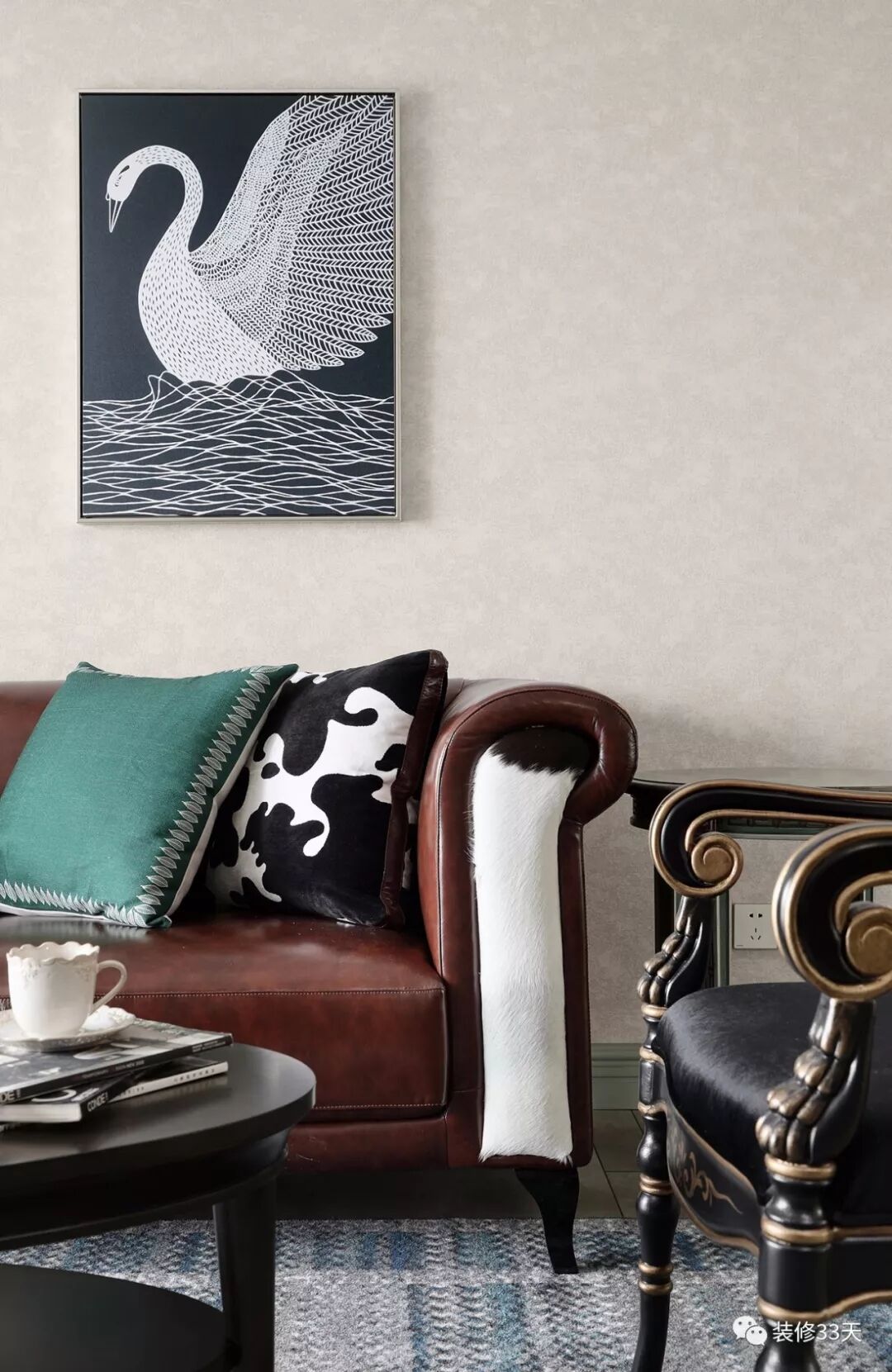 ▲ 咖色皮质沙发,碎花单椅,彩色抱枕增添色彩