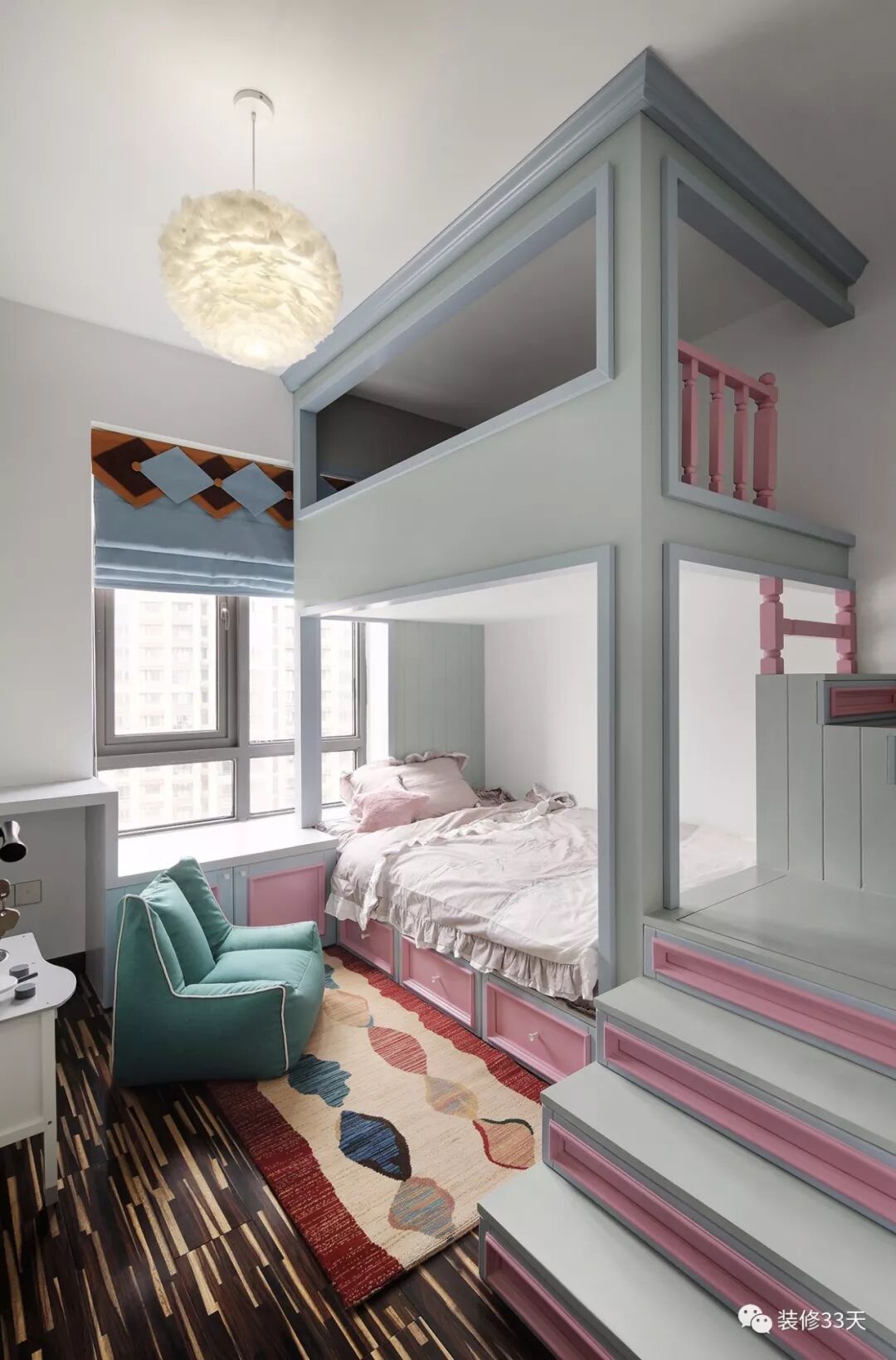 ▲ 儿童房定制飘窗柜增加收纳,置顶双层床设计像个小木屋