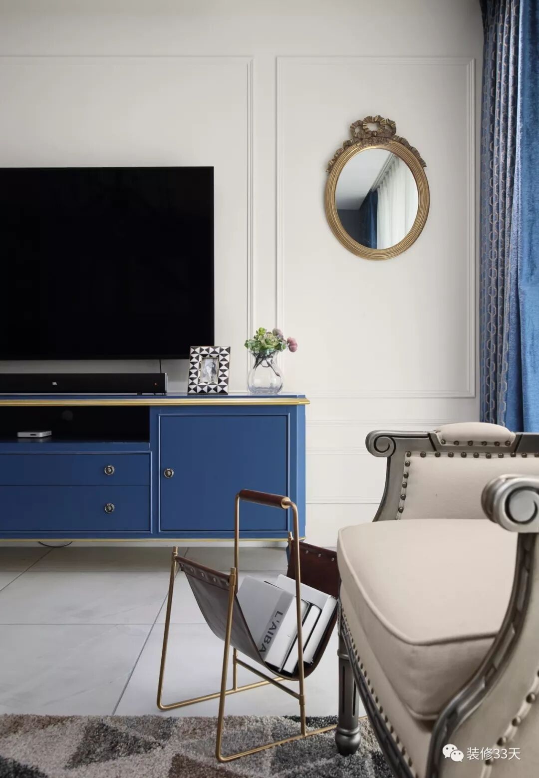▲ 电视柜虽然是蓝色的,但用金色点缀了,加上杂志架和装饰镜都是金色