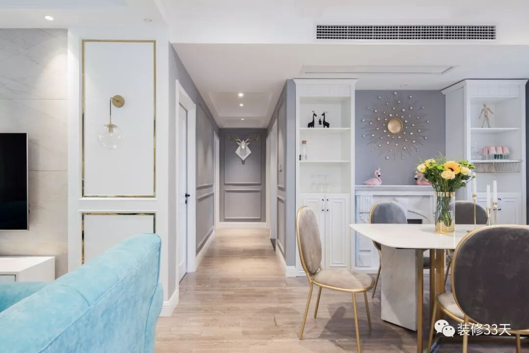 ▲ 电视柜和餐桌椅的脚都是金色的,吊灯和装饰画框也是金色