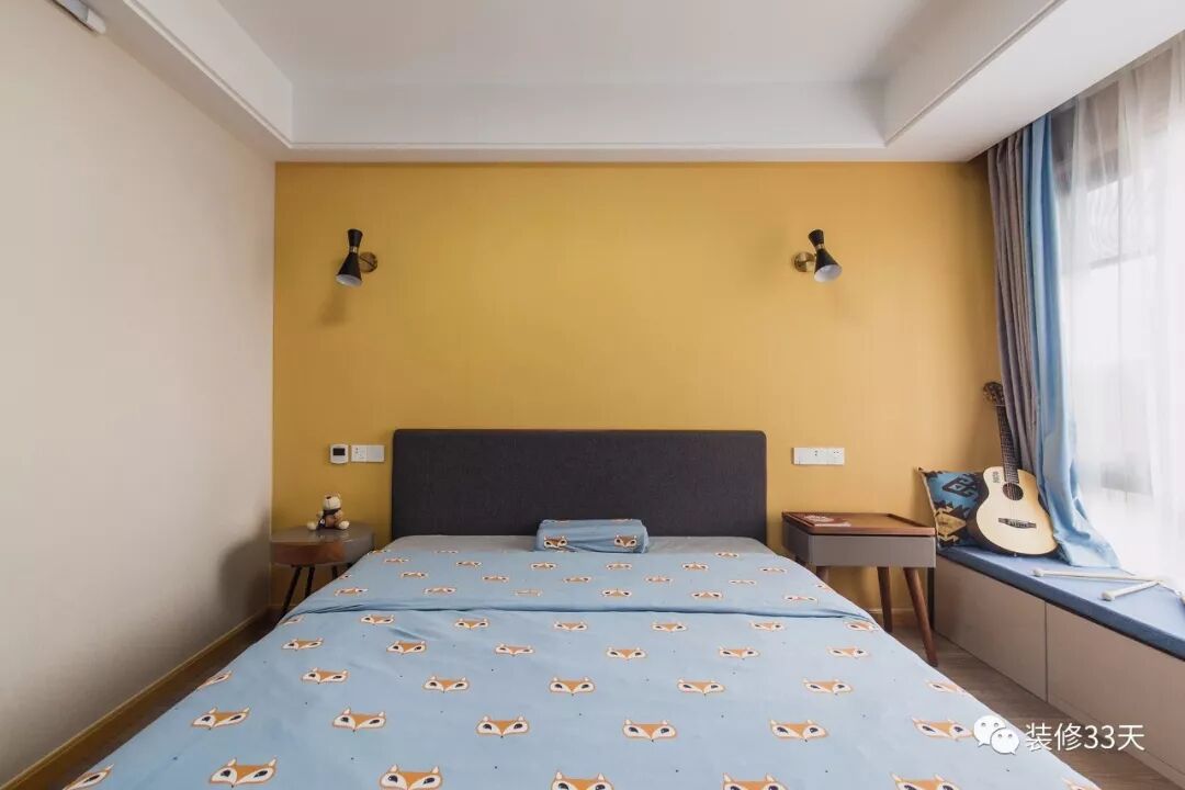▲ 儿童房,一面姜黄色背景墙结合蓝灰色软装搭配,方圆款床头柜增添趣味