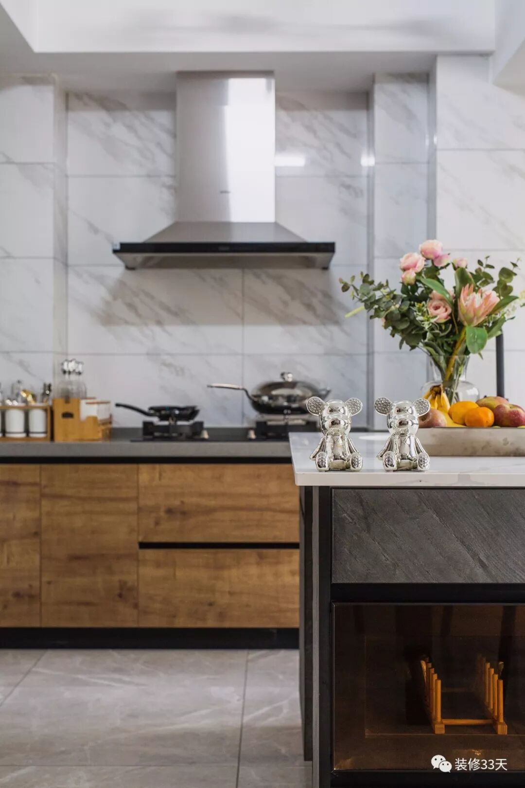▲ 石纹瓷砖搭配木纹橱柜门,大气自然