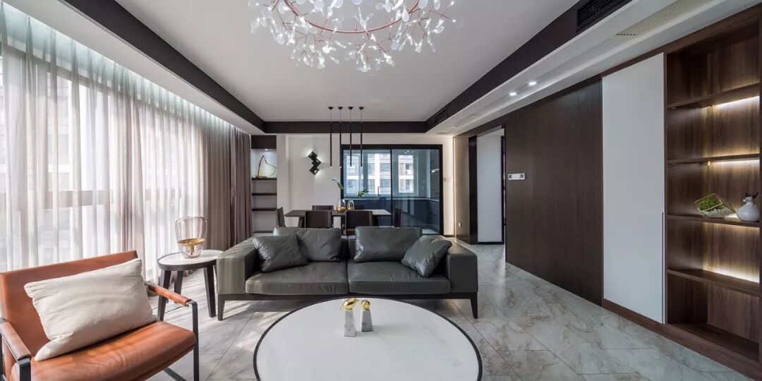 ▲ 大理石铺贴电视背景墙,搭配纯黑色现代风电视柜,与沙发茶几配色统一
